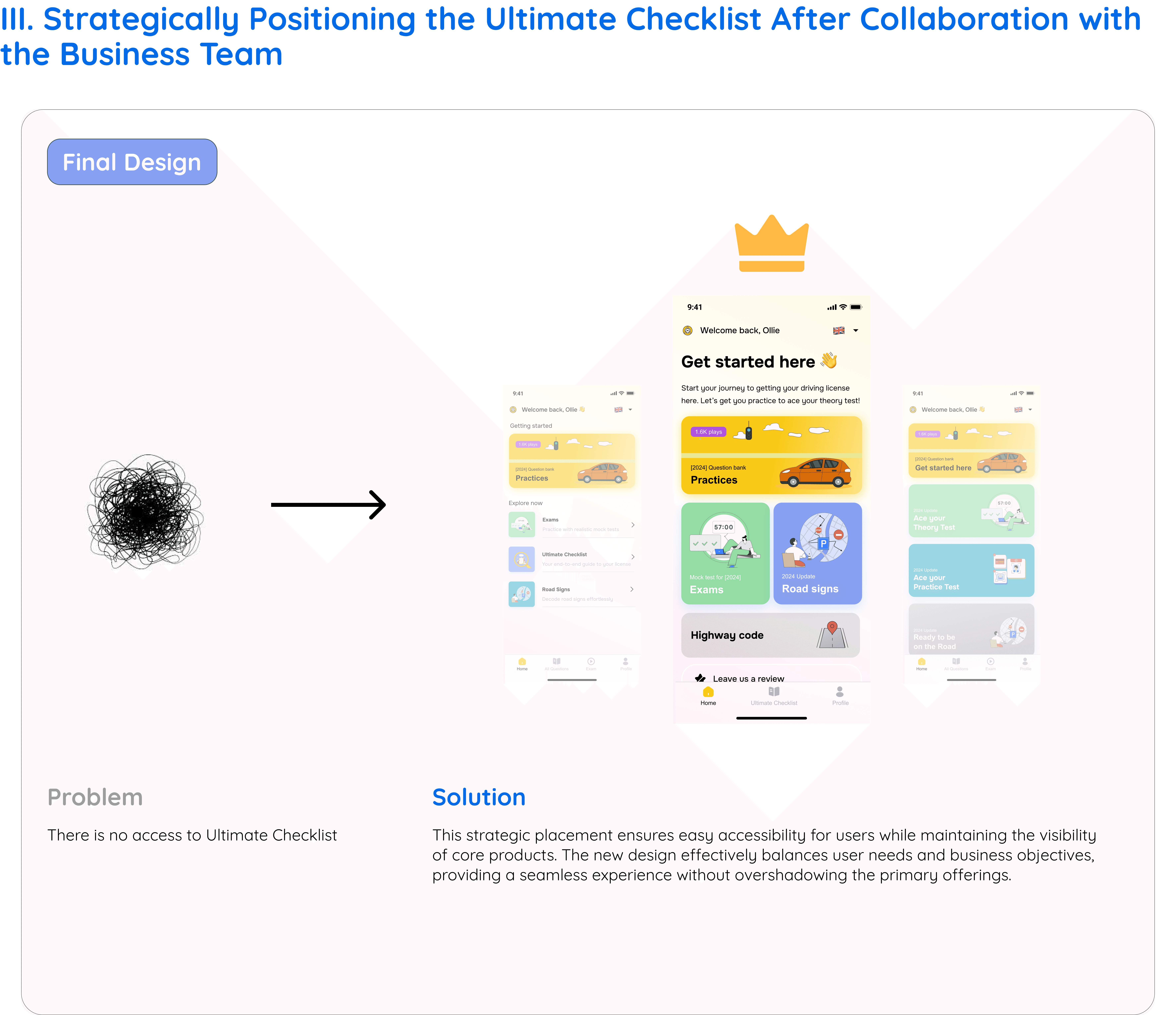 Bringing the Ultimate Checklist to life required ongoing collaboration with the business and development teams. Aligning different priorities and goals was challenging, but I took the initiative to facilitate discussions and propose solutions that balanced feature visibility with business objectives. Despite tight timelines and resource constraints, I ensured that user needs remained at the forefront of every decision.