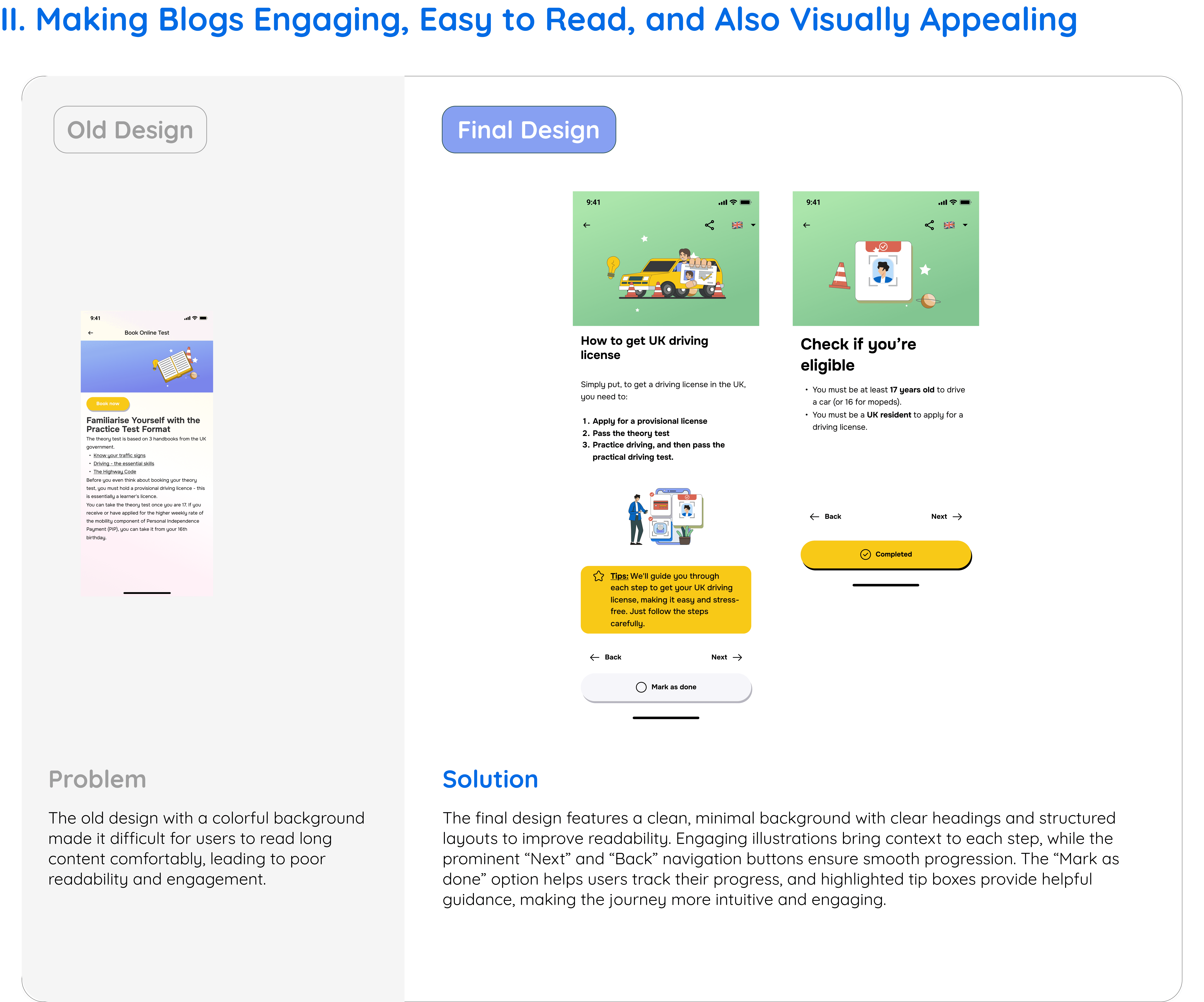 Working closely with the development and content teams, I ensured that the checklist followed best design practices and fit within the existing technical framework. This collaboration allowed us to overcome content-related constraints while delivering an intuitive and accessible experience.