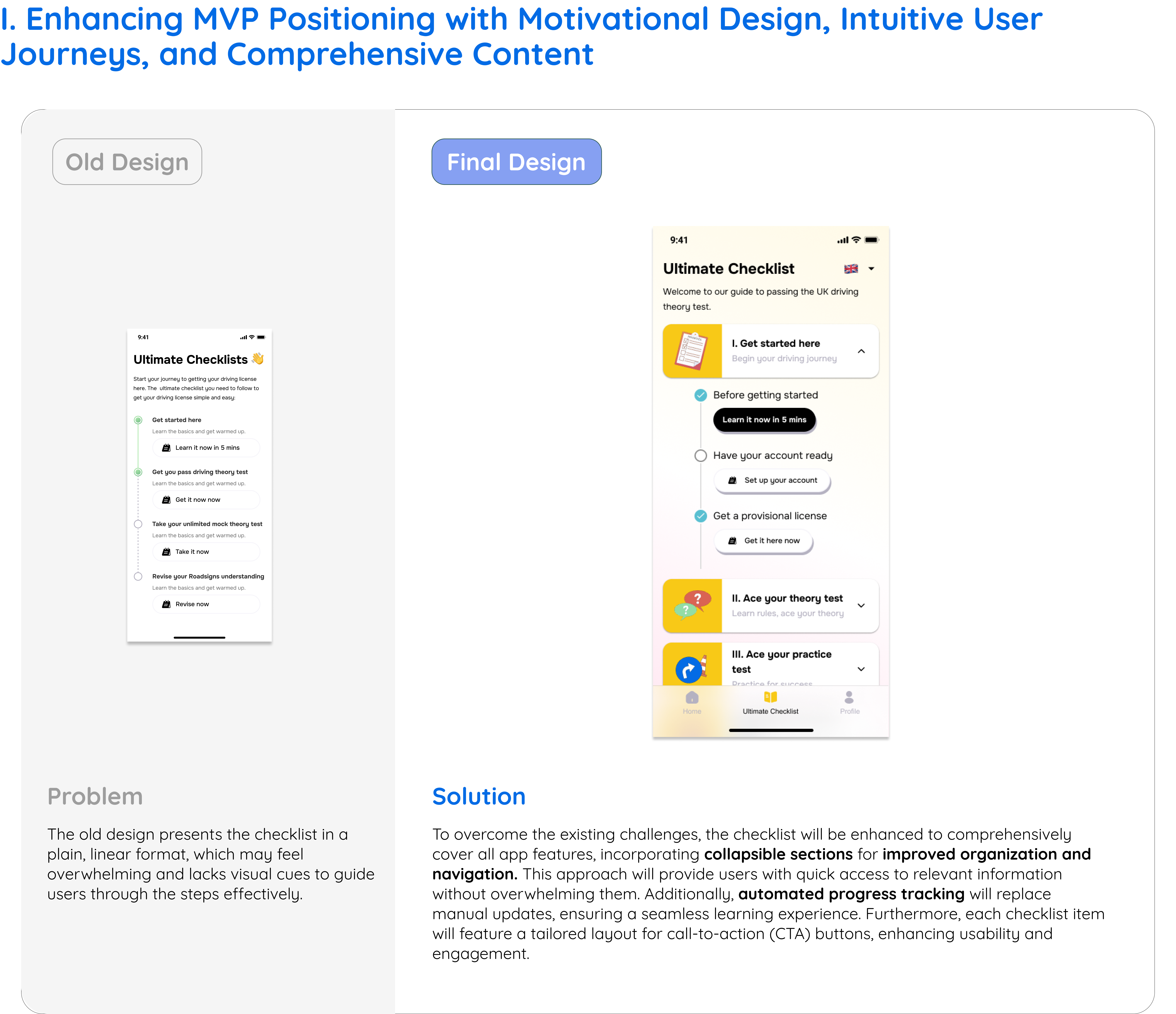 The Ultimate Checklist is a core feature within the Driving Theory Ultimate Kit UK app, designed to empower users by providing a structured yet flexible study plan. The goal was to help users track their progress effectively, prioritize tasks, and stay motivated throughout their driving theory preparation, ultimately giving them confidence in passing their test.