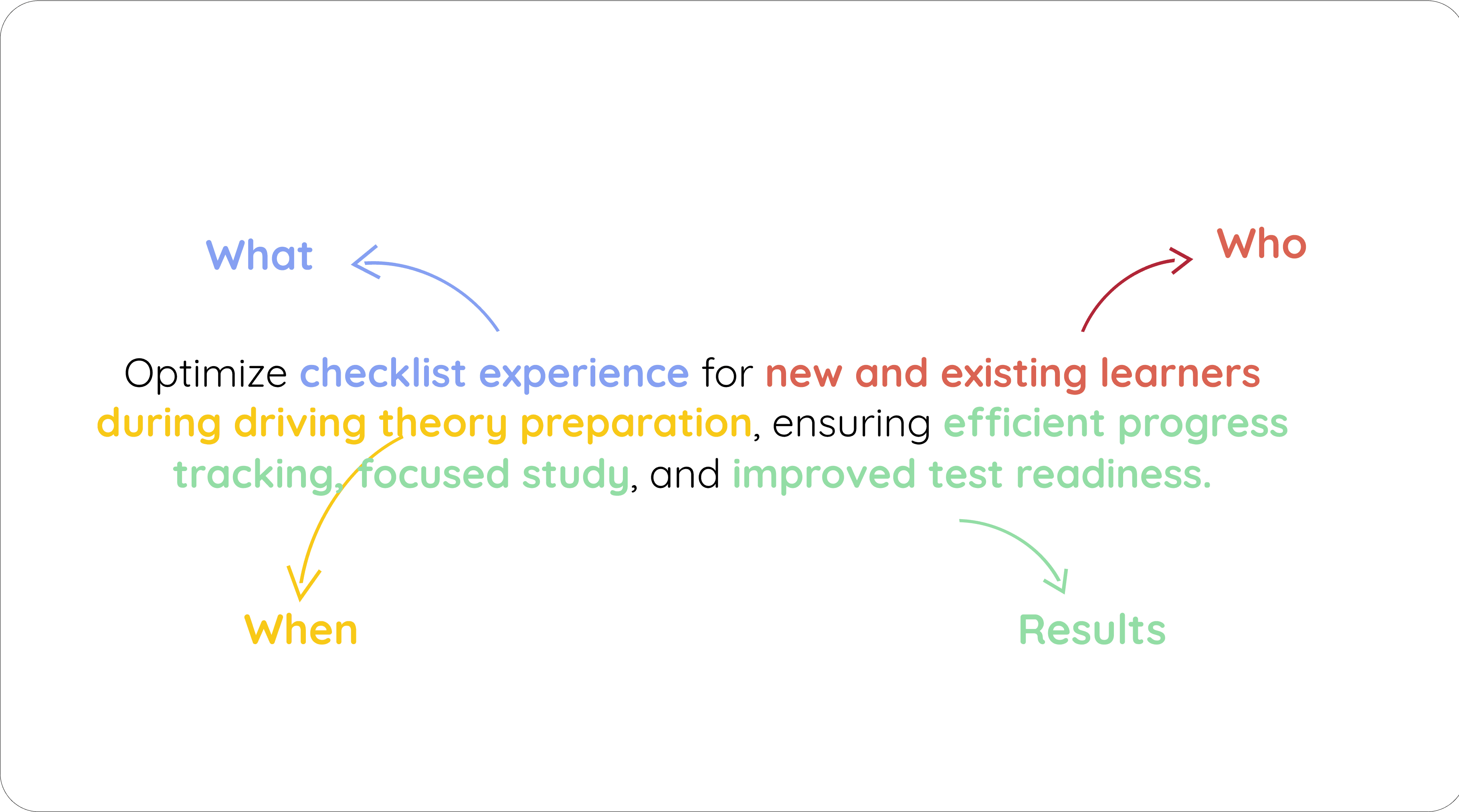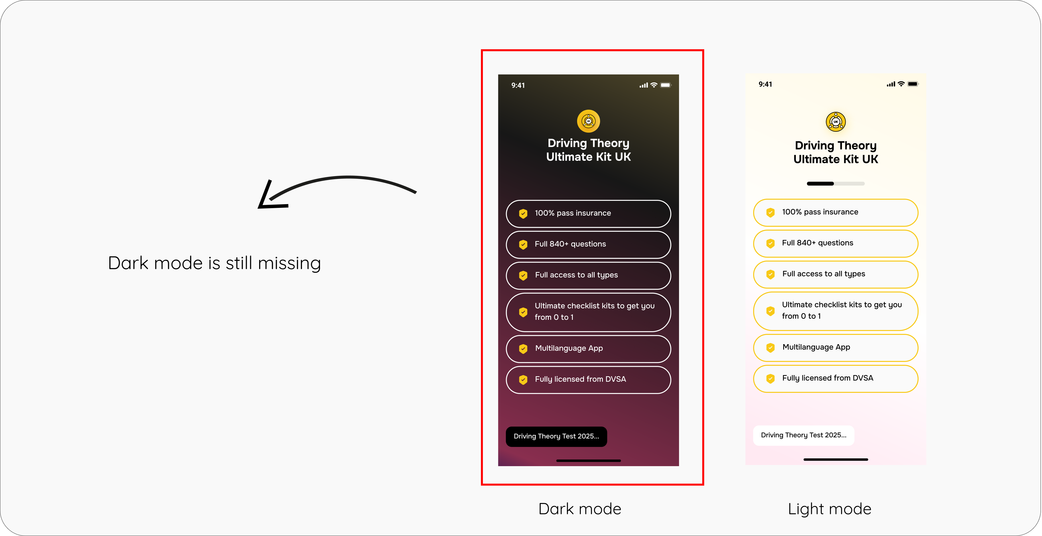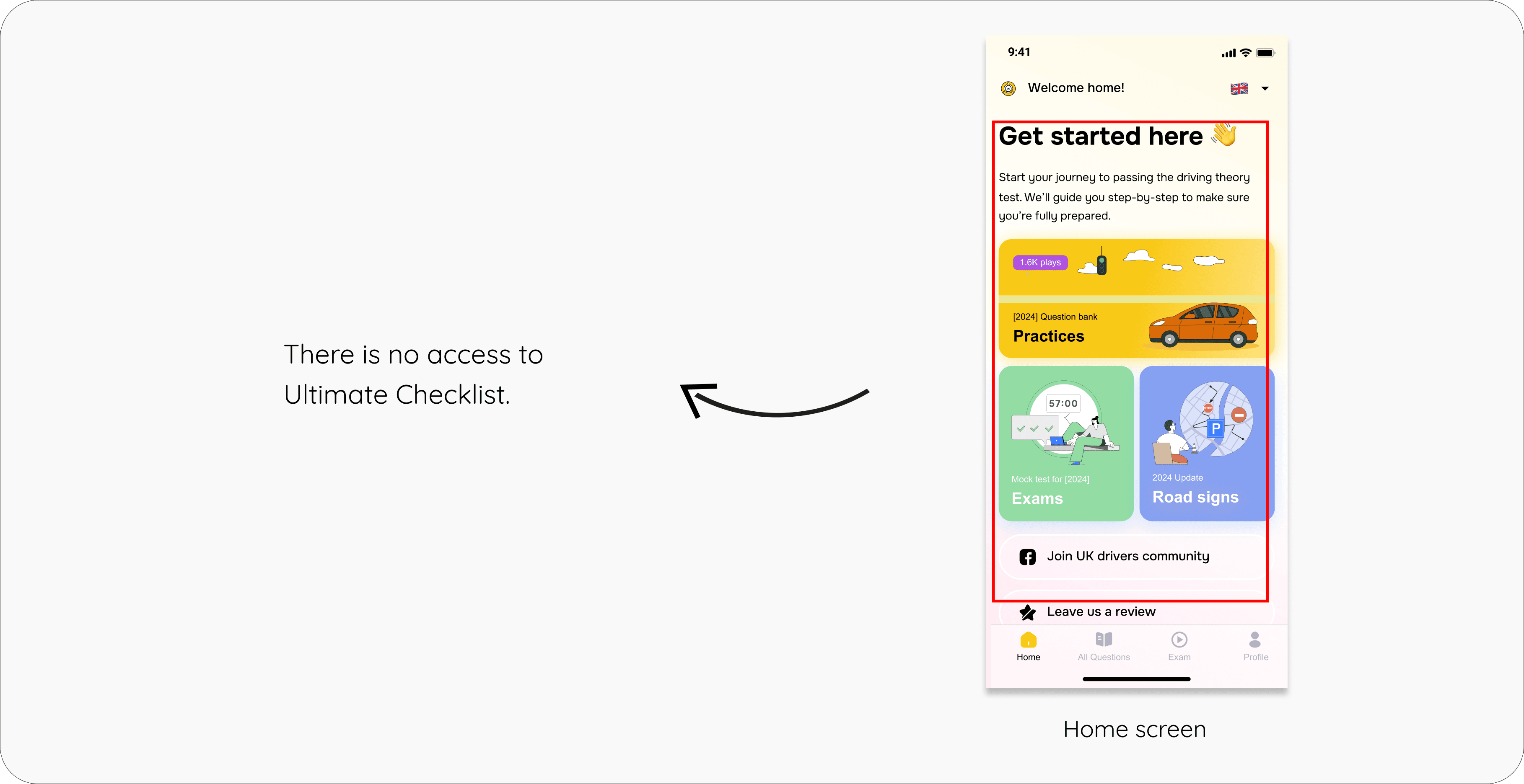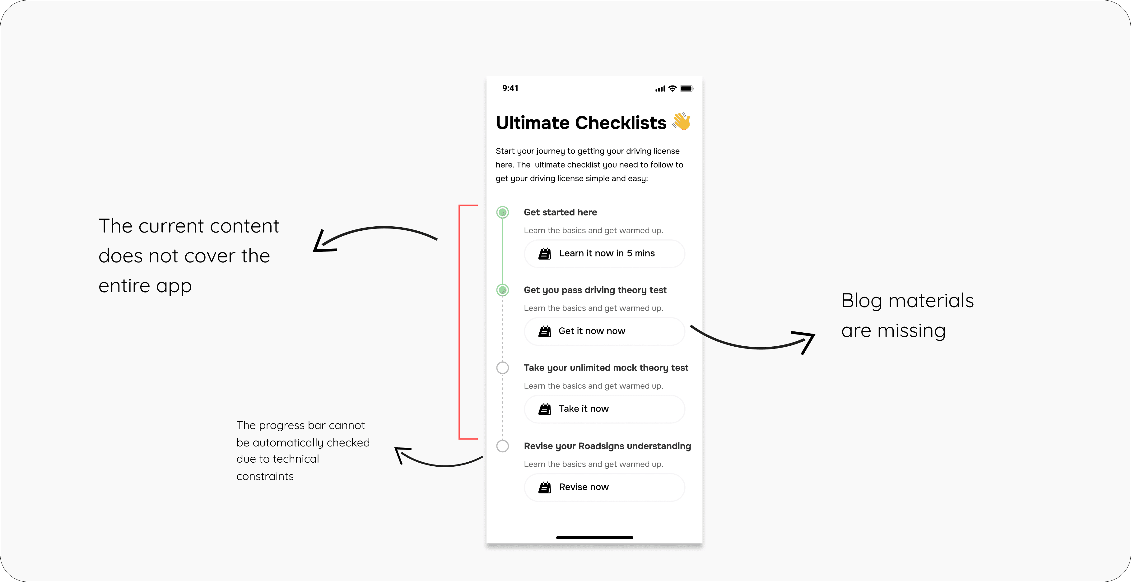 To create an Ultimate Checklist that not only provides comprehensive content but also enhances user motivation and engagement, I conducted thorough competitor research. This involved analyzing various driving theory apps to understand their strengths and gaps in features such as progress tracking, user-friendliness, and accessibility. Our goal was to identify key opportunities to develop a checklist that helps users stay organized, track their progress effortlessly, and enjoy an intuitive learning experience.