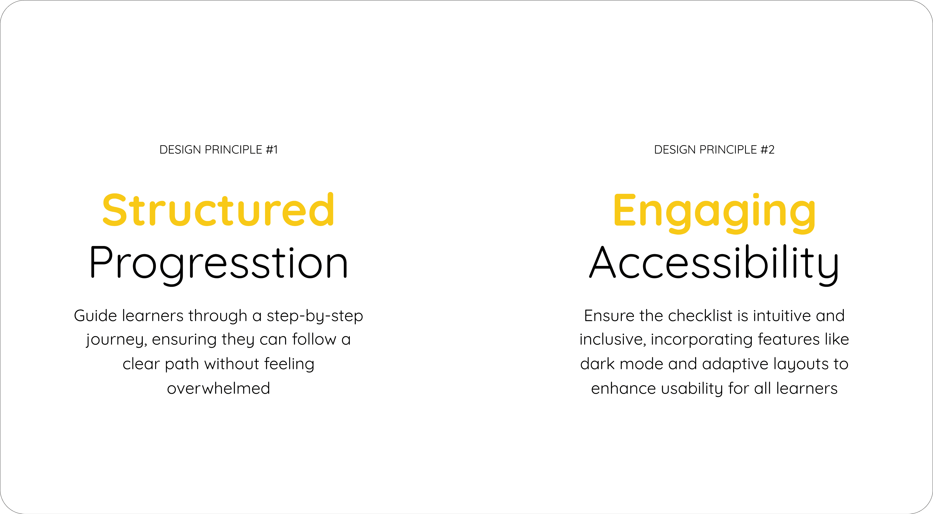To design an effective Ultimate Checklist, we conducted user interviews to explore how much content is necessary to meet user needs. Our focus was to strike a balance between comprehensive coverage and ease of use to ensure learners stay engaged and motivated.