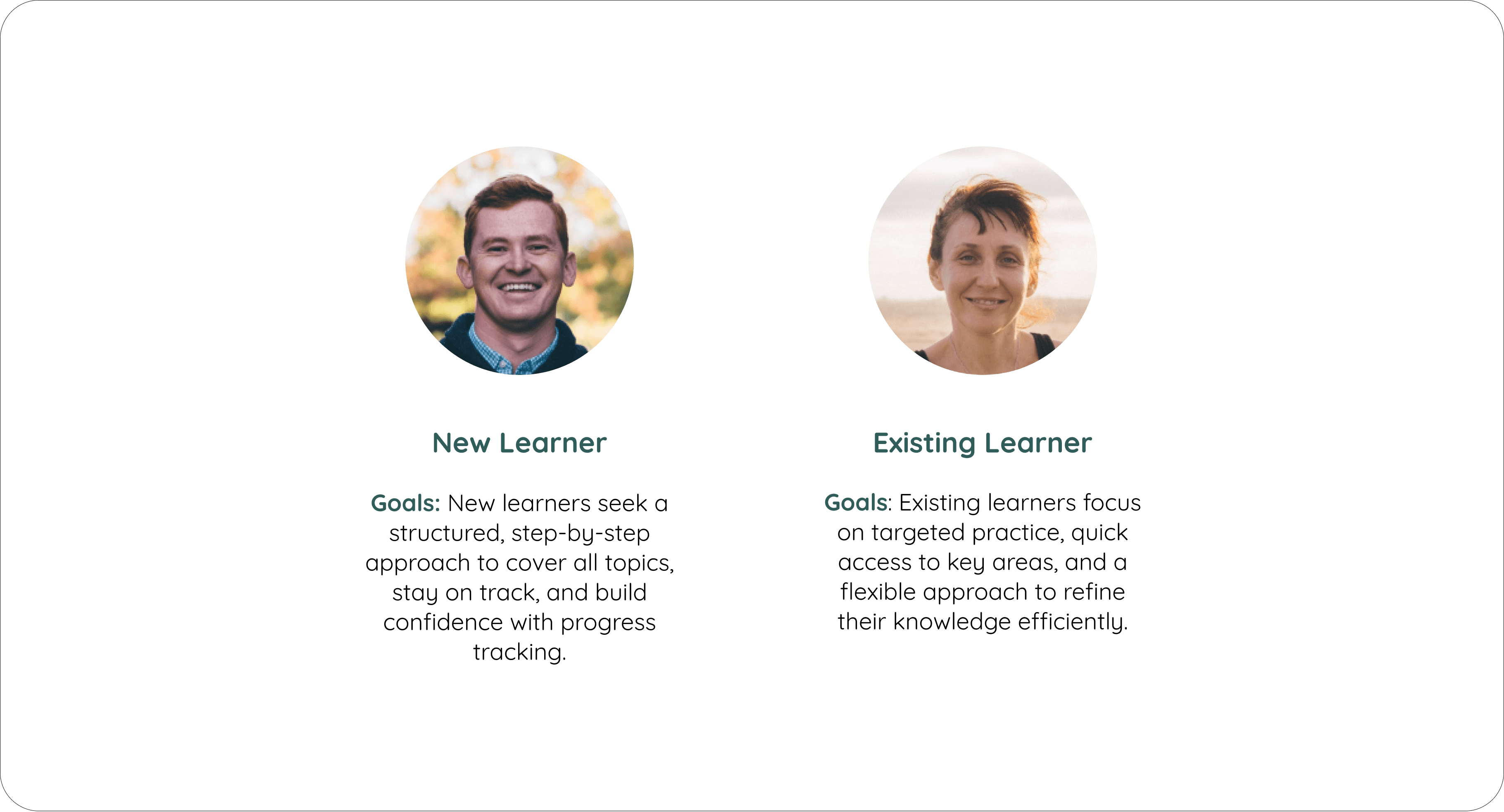 Based on our research, we identified two primary user archetypes for the UK Driving Theory Kit app, each with distinct motivations and goals to support their learning journey effectively: